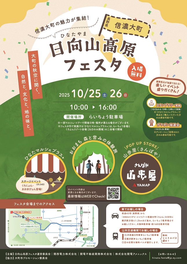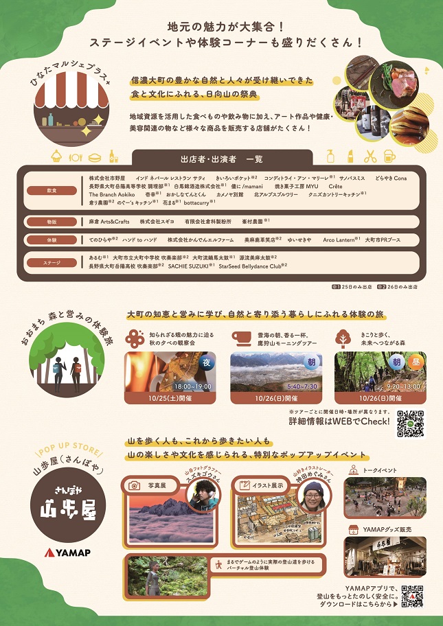 信濃大町およびその周辺エリアの魅力をより多くの方々に知って頂きたいとの思いから、マルシェ・ツアー・ハイカーズイベントで構成される「信濃大町 日向山高原フェスタ」を2025年10月25日(土)・26日(日)の2日間、開催いたします!