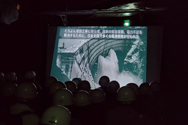 ツアーの内容を簡単に紹介します!黒部ダムを見学後、公開されていない工事跡トンネル内で破砕帯突破を含む黒部ダム建設のビデオを視聴し、さく岩機の振動等を体験していただきます。その後、電気バスの特別臨時便に乗車し、一般の旅行者では降り立つことができない破砕帯区間を歩いたり、破砕帯から出る湧き水に触れたりできる貴重なツアーとなっております。
